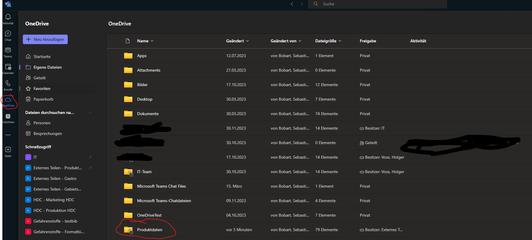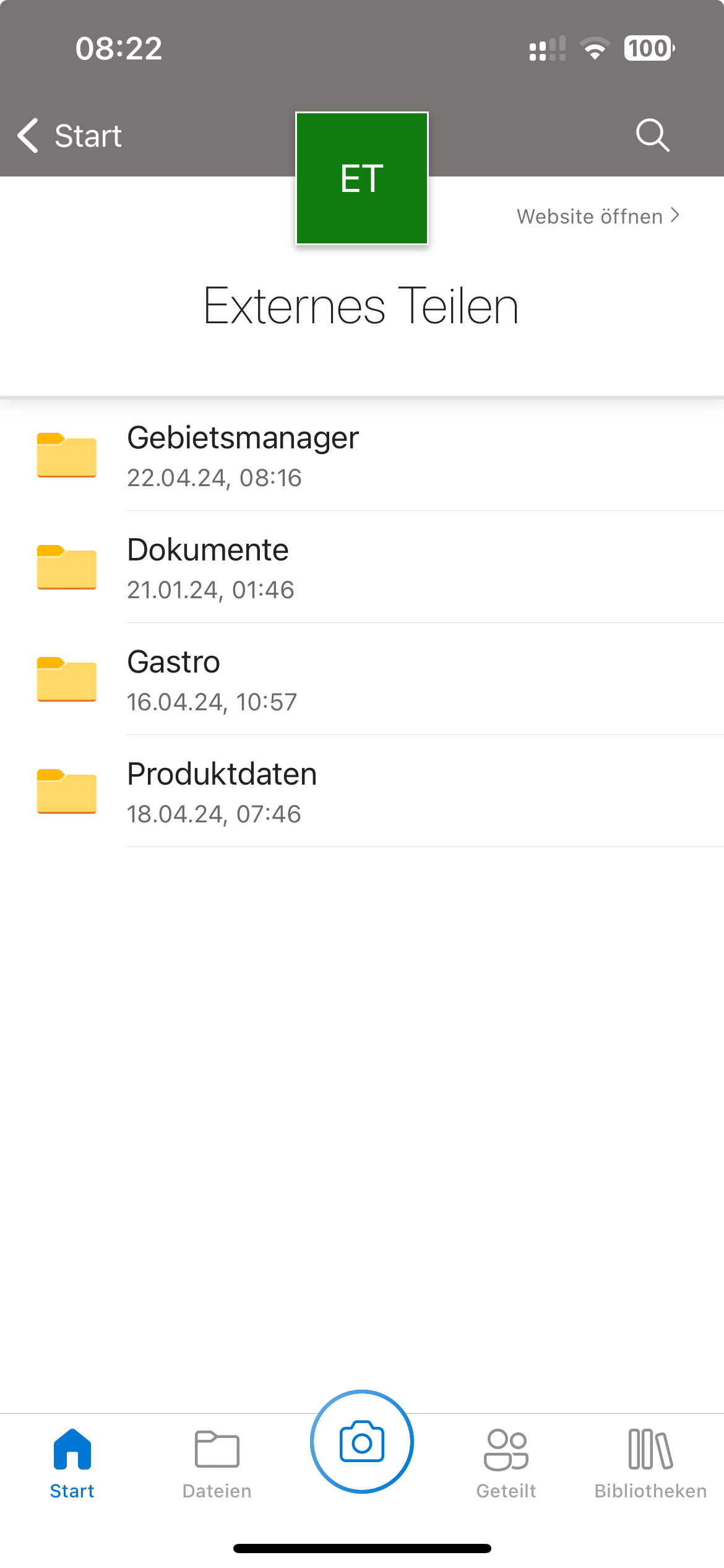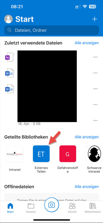 Bereits in der Startseite werden alle SharePoint Sites bei denen man Mitglied ist unter Geteilte Bibliotheken angezeigt. Der Ordner Produktdaten ist Teil der SharePoint Site "Externes Teilen".