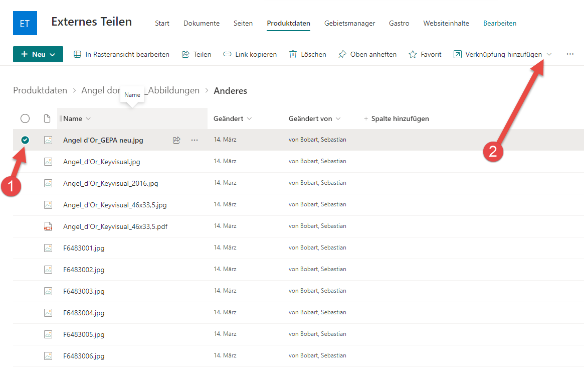 Wird die Site "Externes Teilen" geöffnet erhält man Zugang zum Ordner Produktdaten.