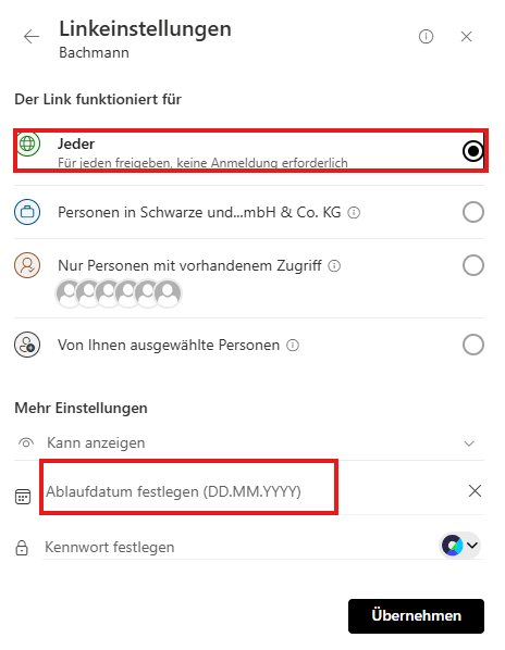 4. An dieser Stelle setzen sie jetzt die Einstellungen auf jeder, um Externen den Zugriff zu gewähren und Legen und ein Ablaufdatum für diese Freigabe Fest. Wichtig: Damit nicht zu viele Links veröffentlicht worden ist es wichtig das Sie bei jedem Link ein Datum Hinterlegen!