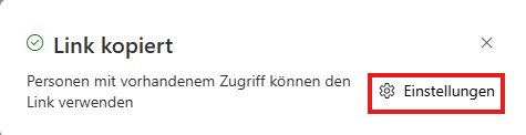 3. Nun wird direkt ein Link erstellt und automatisch kopiert. Um die Berichtigungen anzupassen, klicken sie jetzt auf Einstellungen.