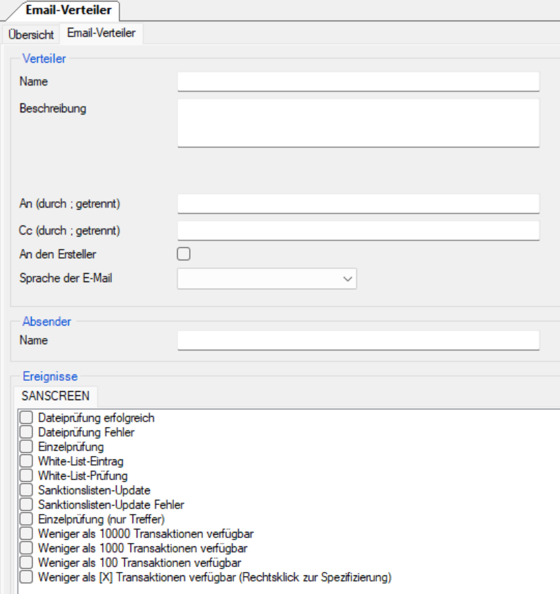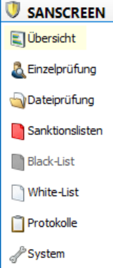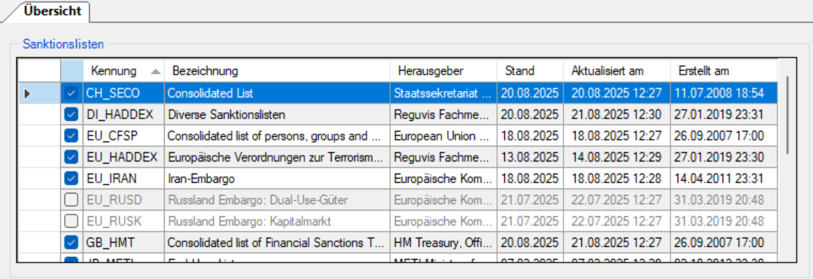 Unter Sanktionslisten findet man alle freigeschalteten Sanktionslisten. Diese Listen kann man individuell an- und abhaken.