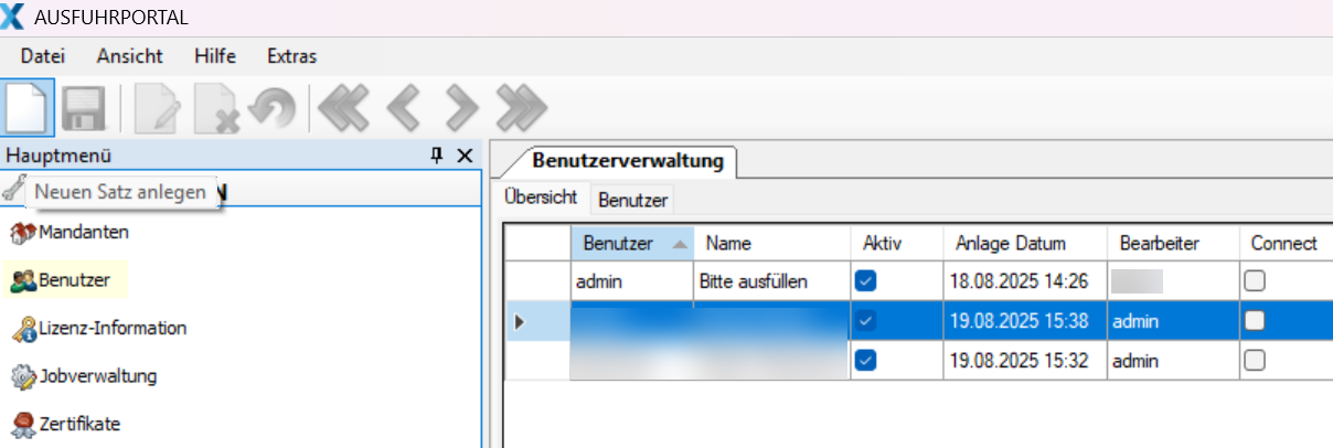 Hier sieht man alle angelegten Benutzer und kann mit entsprechender Berechtigung auch neue Benutzer anlegen.