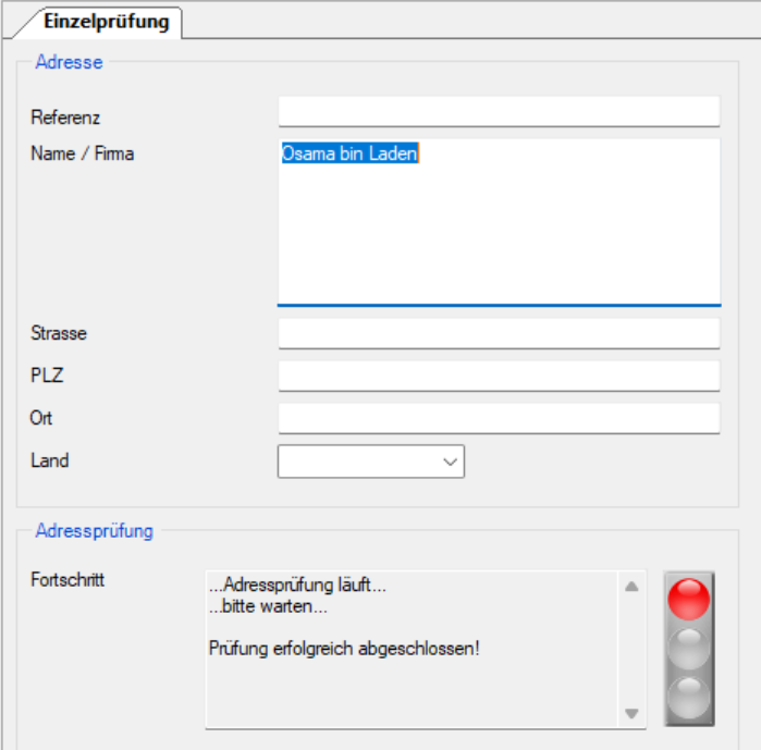Möchte man nur einzelne Datensätze gegen die Sanktionslisten prüfen, kann man hier die bekannten Adressdaten eintragen.