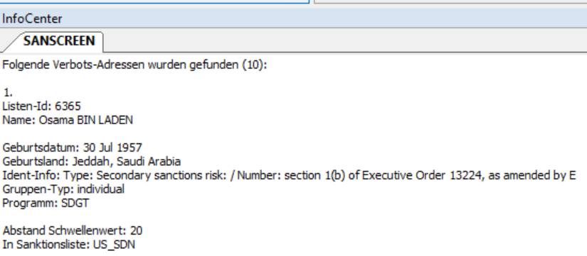 Im oberen Beispiel ist die Ampel rot, da es sich bei Osama bin Laden um eine sanktionierte Person handelt.