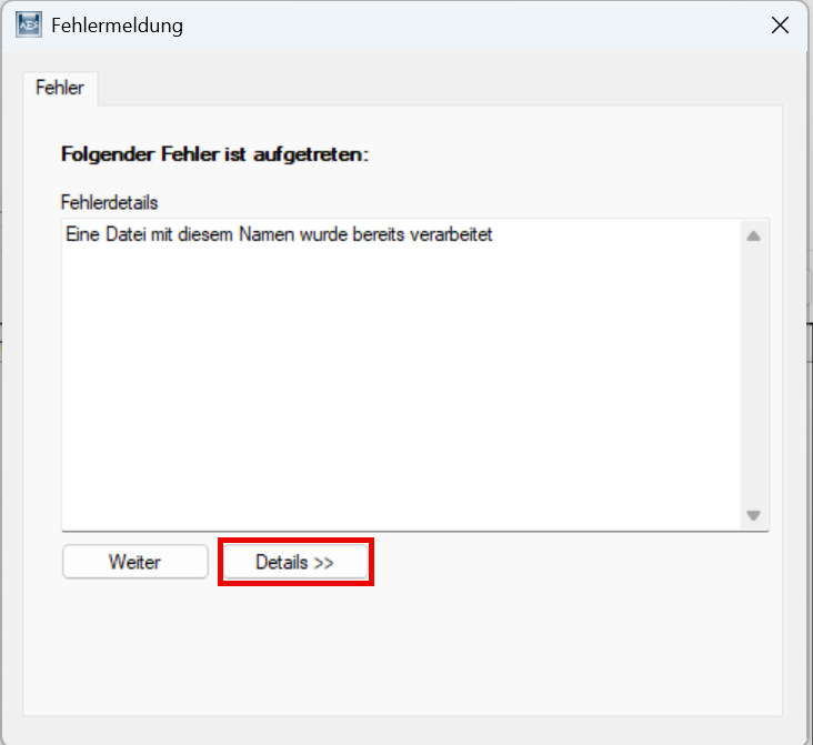Hierzu geht man innerhalb der Fehlermeldung auf den Button "Details >>".