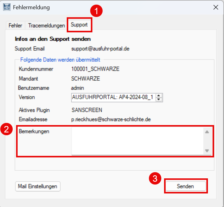 Hier kann man dann auch eine Bemerkung bezüglich des auftretenden Problems eintragen.