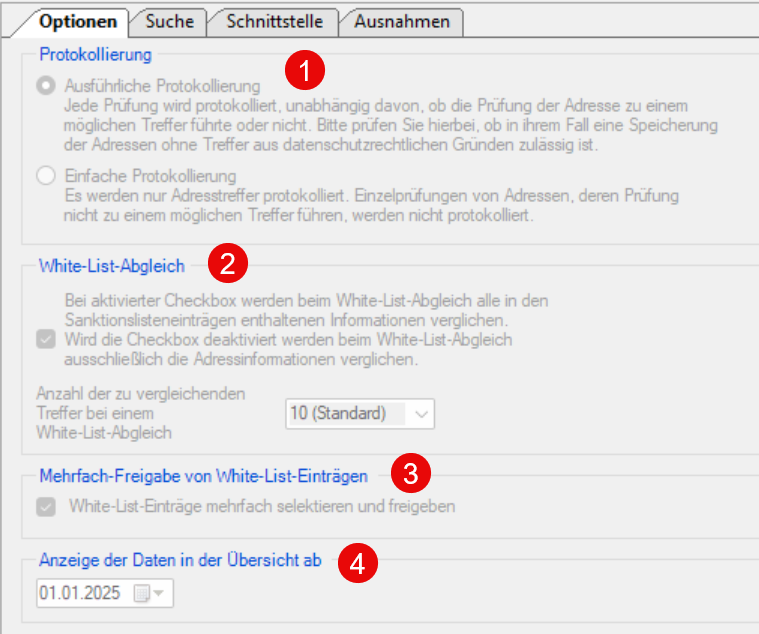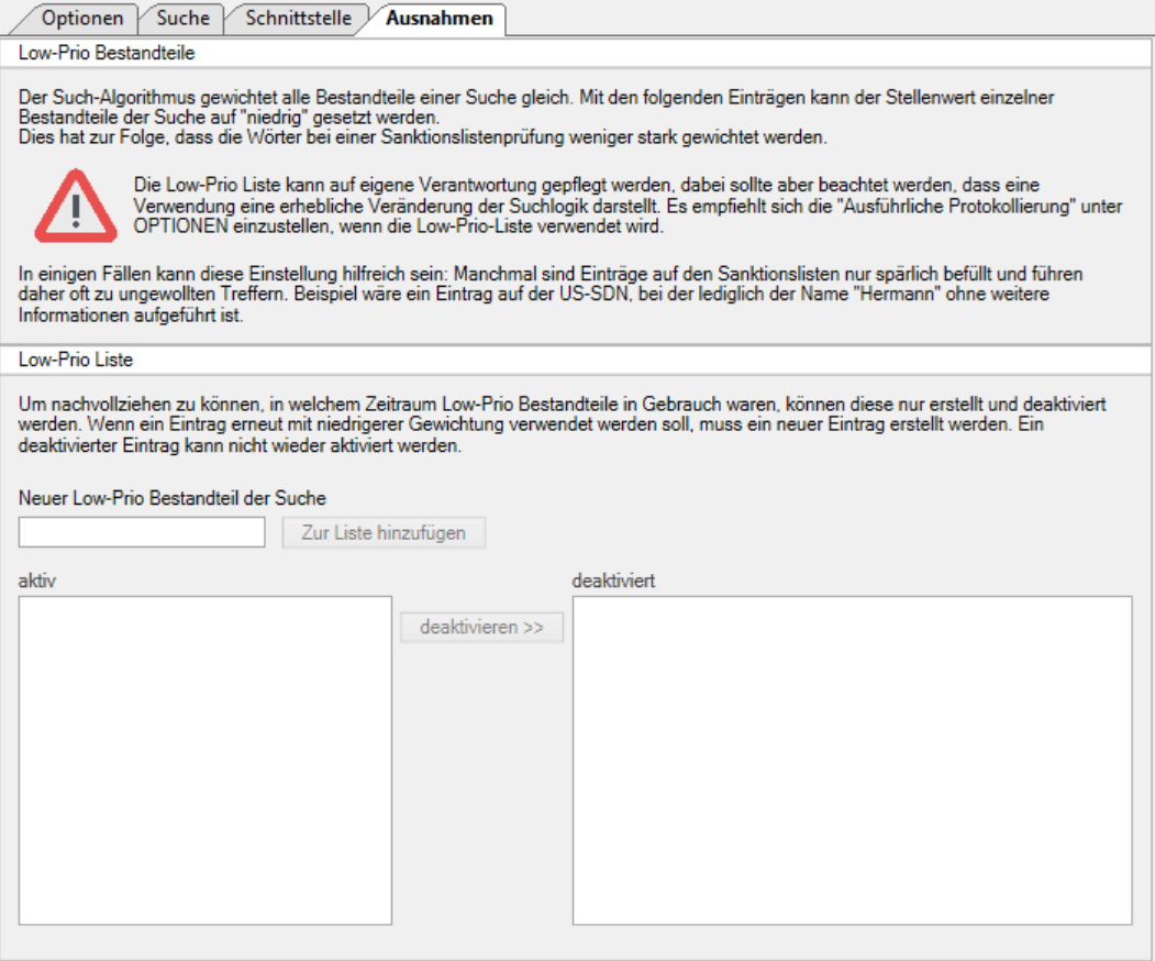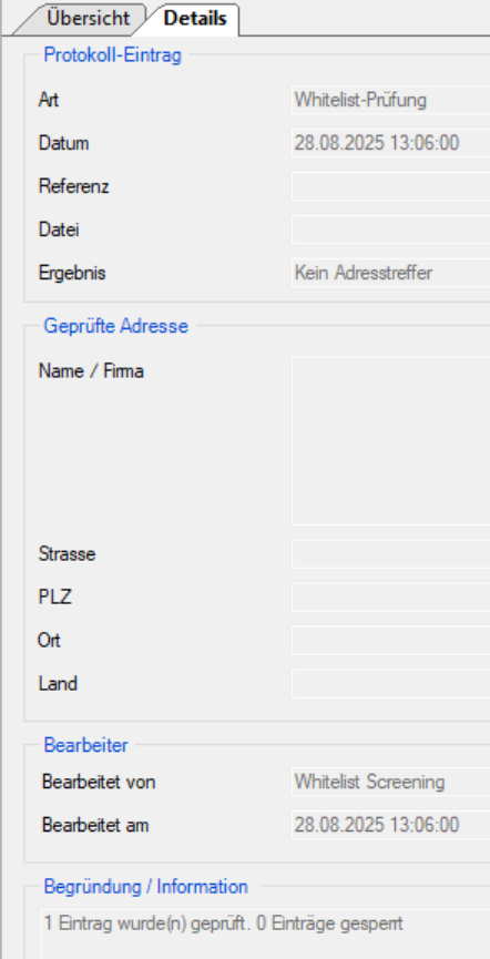 Bei der Dateiprüfung wird der Whitelist-Eintrag weiterhin überprüft, er wird nur nicht mehr angezeigt. Er wird nur in dem Fall angezeigt, wenn es ein Update bei einer Sanktionsliste gibt.
