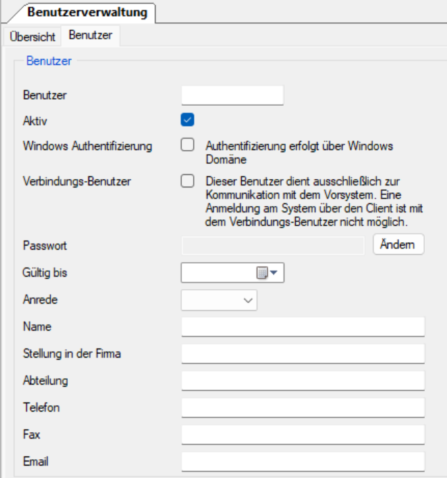 Ein Verbindungs-Benutzer wird nur in Einzelfällen benötigt, nämlich dann, wenn ein spezifischer Datenaustausch zu einem Vorsystem (z.B. einem ERP-System) stattfinden soll.