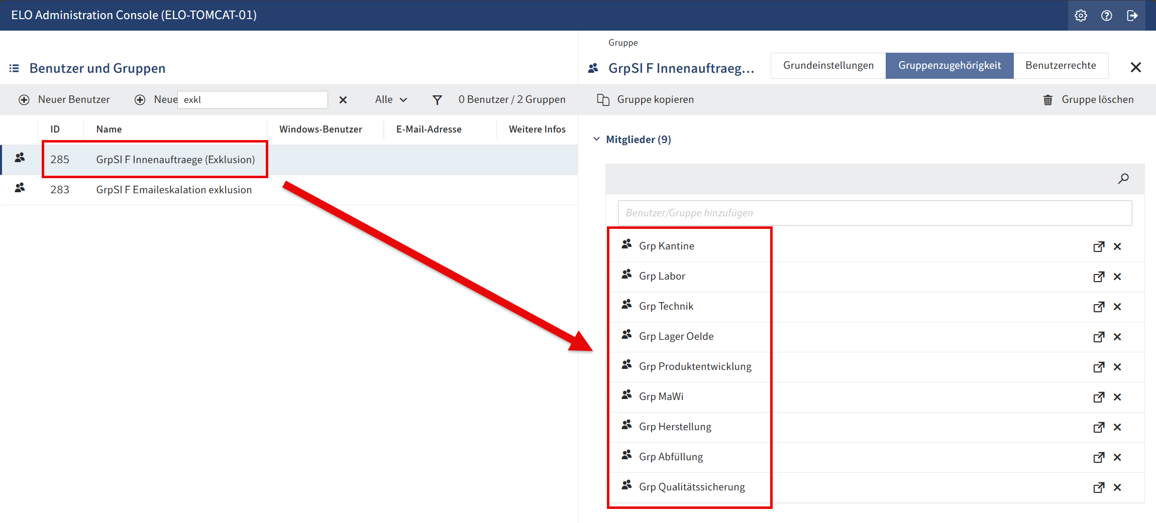 Im ELO wurde eine Gruppe angelegt, die von der Eingabe der Innenaufträge ausgenommen ist. In dieser Gruppe gibt es mehrere Gruppen: