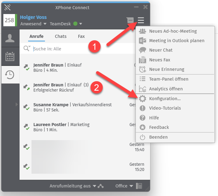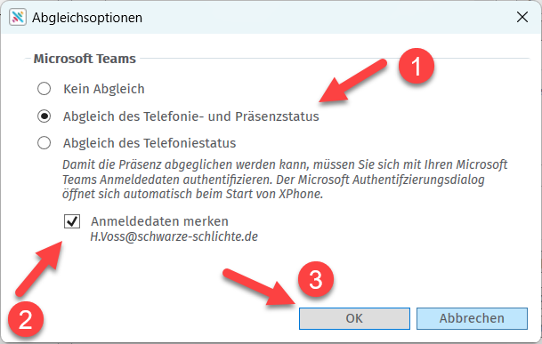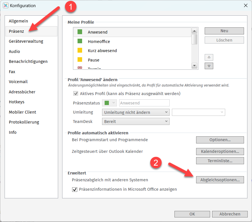 Damit während eines Teams-Meetings dieser Status auch in der Telefonleiste angezeigt wird, muss in der Konfiguration für XPhone Connect der Ableich des Telefonie- und Präsenzstatus eingerichtet werden: